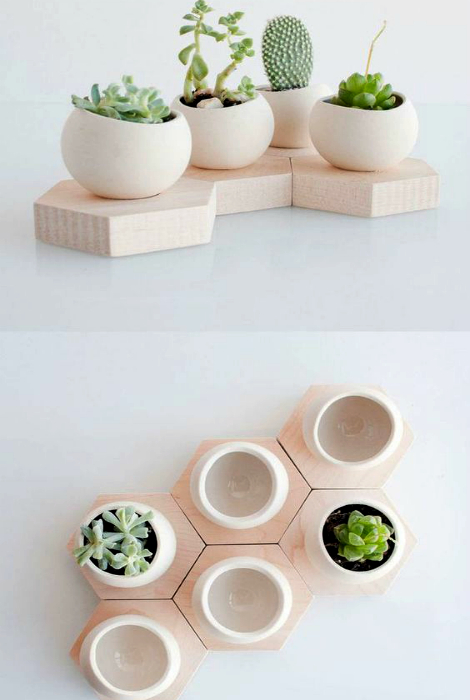 Оригинальные шестиугольные подставки из светлого дерева, которые можно использовать, как на горизонтальных поверхностях, так и для украшения стен.