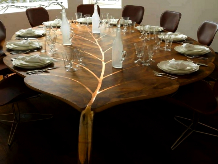 Великолепный обеденный стол в виде листка, выполненный из дерева и украшенный волшебной подсветкой станет настоящей находкой для кухни или столовой.