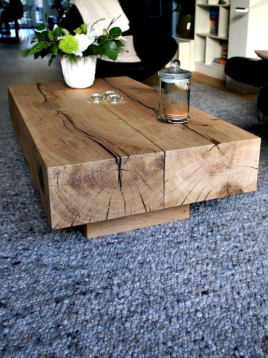 Чудесный кофейный столик, сделанный из грубых деревянных балок, прекрасно впишется в интерьер гостиной, оформленной в рустикальном или кантри стиле.