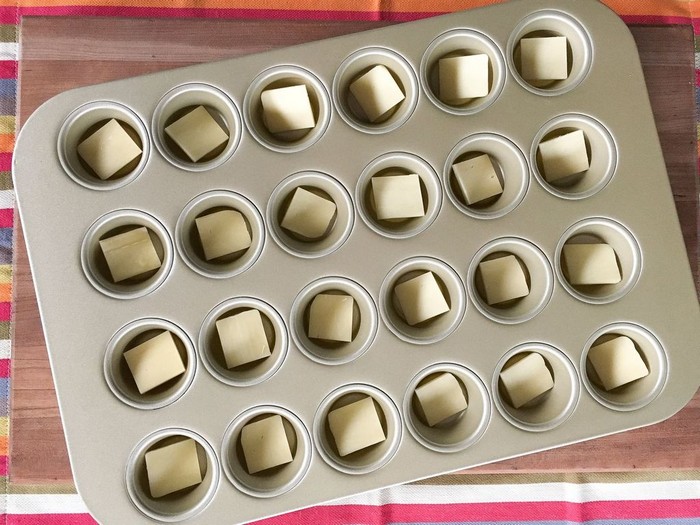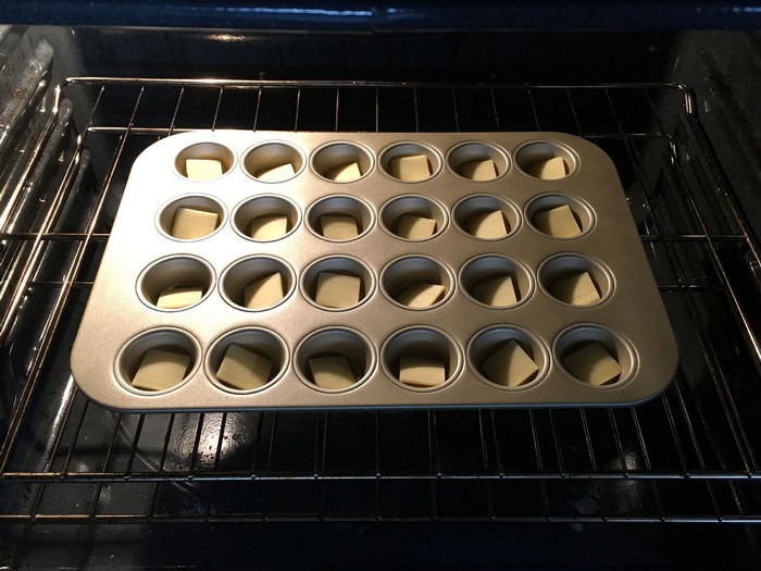Разогрейте духовку до 177 градусов. Сыр порежьте квадратами, кубиками (в зависимости от формы для выпекания – сыр должен идеально в неё помещаться) или потрите на тёрке. Заполните форму для выпекания или же положите кусочки прямо противень, устелив его пергаментом.